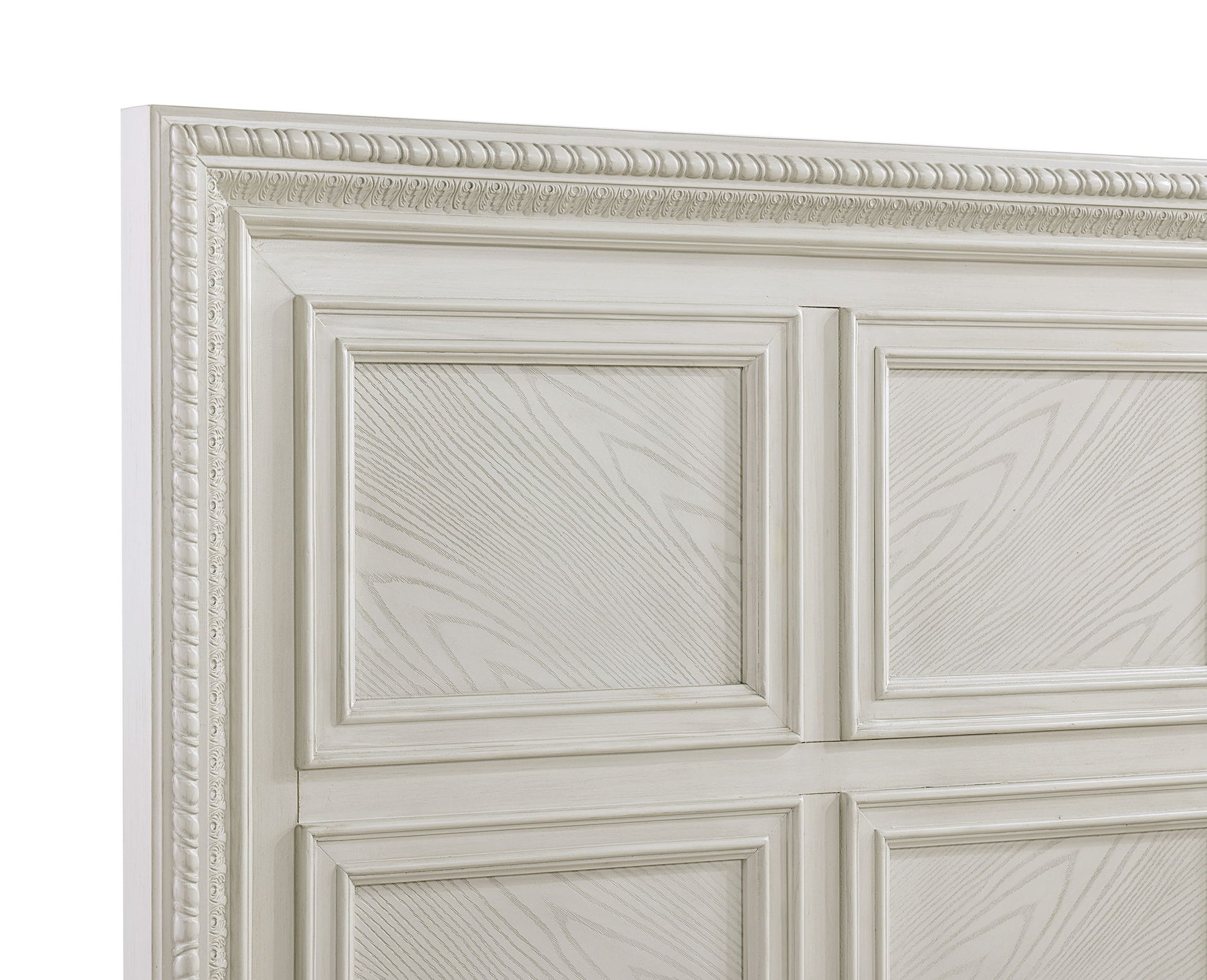 Introducing a bedroom collection that brings a breath of fresh sophistication to any living space. This suite boasts a bright, antique white finish that immediately brightens and opens up a room, providing a versatile foundation for any decor style. The bed's commanding headboard stands as a stately centerpiece, with architectural paneling details that convey a sense of sturdy elegance. Storage needs are gracefully met by the dresser and chest, each accented with refined drawer pulls that offer a subtle contrast and easy access.