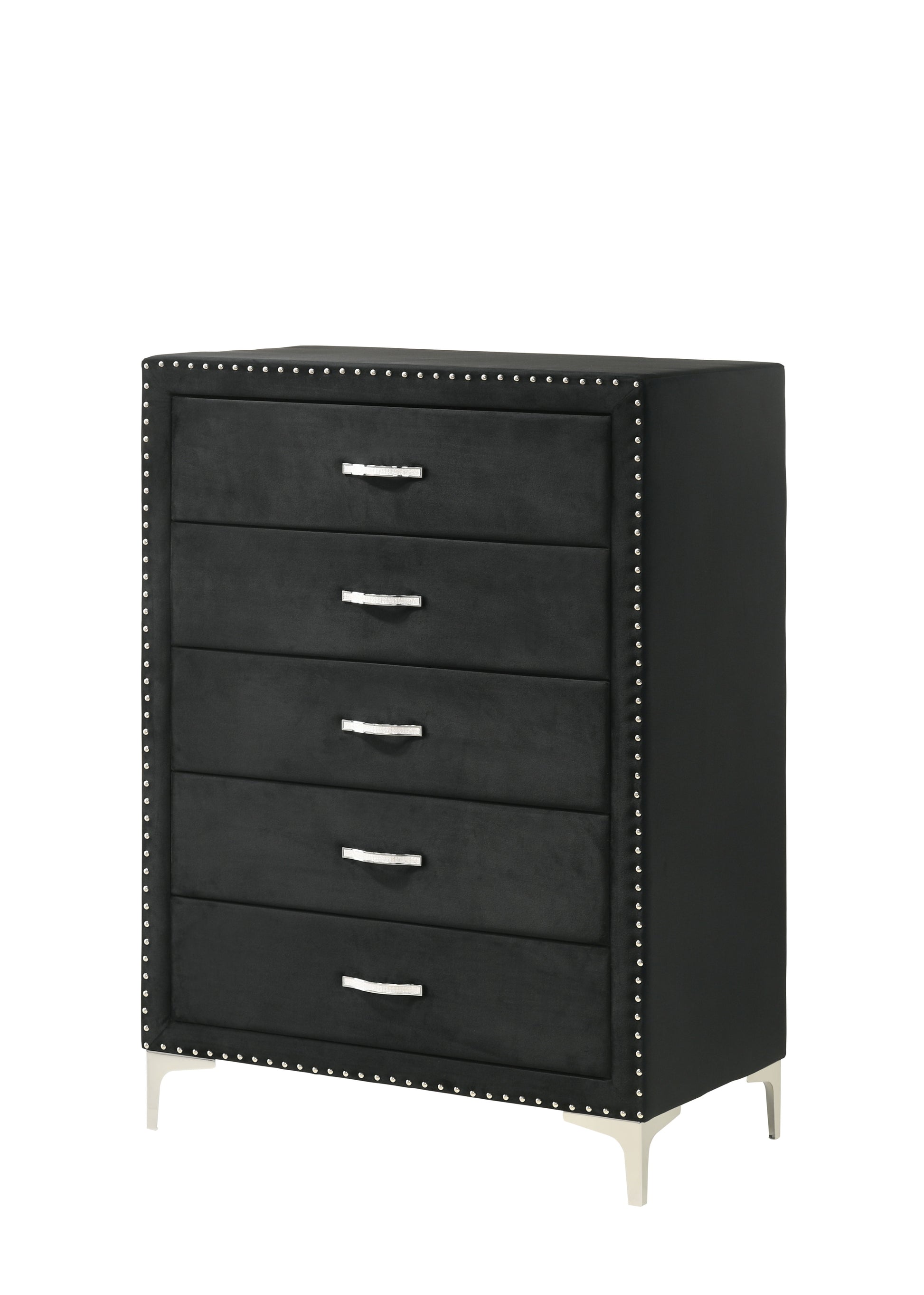 Immerse yourself in the regal charm of this majestic bedroom collection, a true embodiment of luxurious comfort and refined elegance. At the heart lies a bed that commands attention with its impressive wingback headboard, richly upholstered in a rich velvet and adorned with diamond tufting and shining nailhead trim, offering a sophisticated centerpiece. Accompanying the bed are matching pieces, each boasting the same sumptuous fabric and exquisite detailing. The nightstand and chest of drawers stand as stately companions, offering practical storage solutions without compromising on style, their sleek handles gleaming against the dark, plush fabric. The dresser, accompanied by a statement mirror framed with a hint of sparkle, completes the set, creating a harmonious balance between functional design and opulent aesthetics.