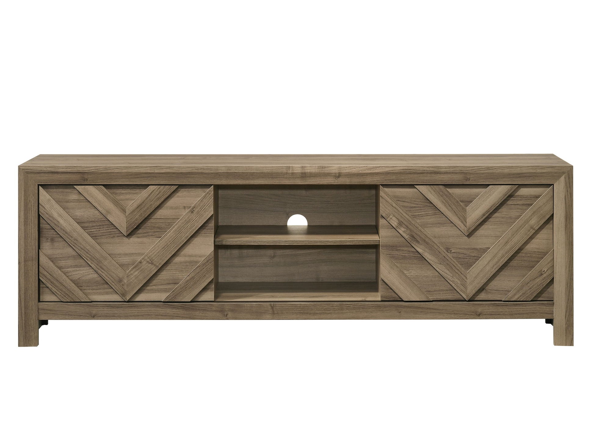 This bedroom collection encapsulates a blend of contemporary design and rustic charm. The centerpiece, a bed with a distinguished chevron patterned headboard, evokes a sense of craftsmanship and texture, infusing the space with character. Flanking the bed are matching pieces, each exhibiting clean lines and a finish that suggests a lived-in elegance. The dresser, complemented by a substantial mirror, along with the tall chest, offer ample storage solutions with understated metal handles that enhance the modern farmhouse aesthetic. A nightstand completes the set, its compact design making it a practical addition to the suite.